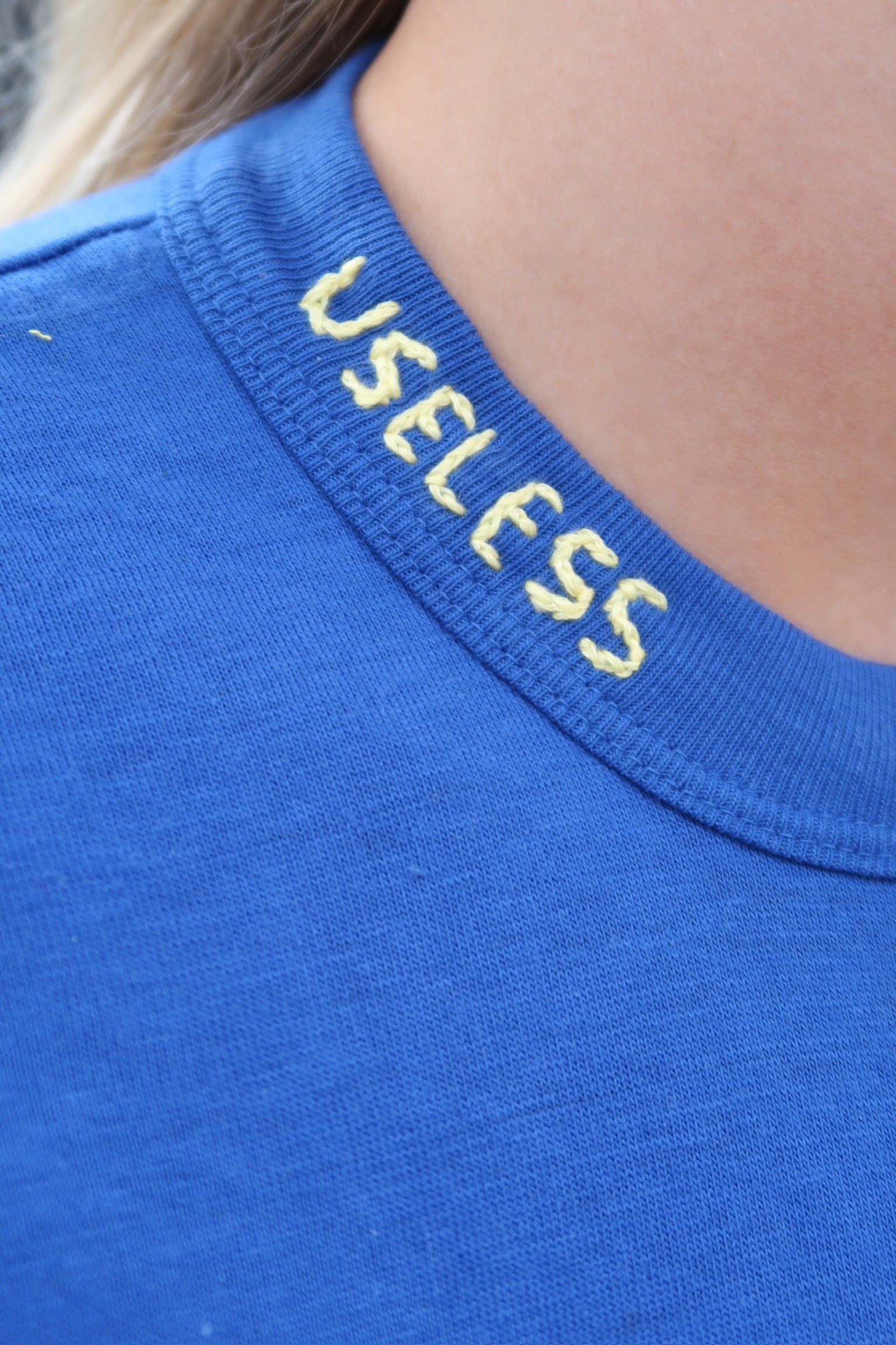 Dead stock 70s blue T which features the Useless motif embroidered in white along the collar and our signature double tab tape on the back neck.