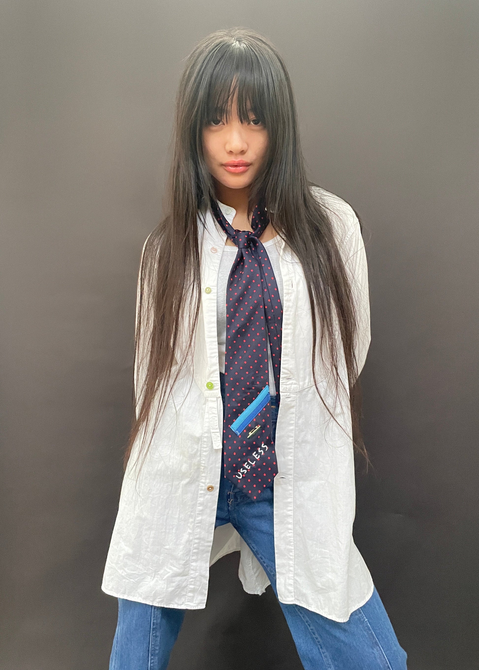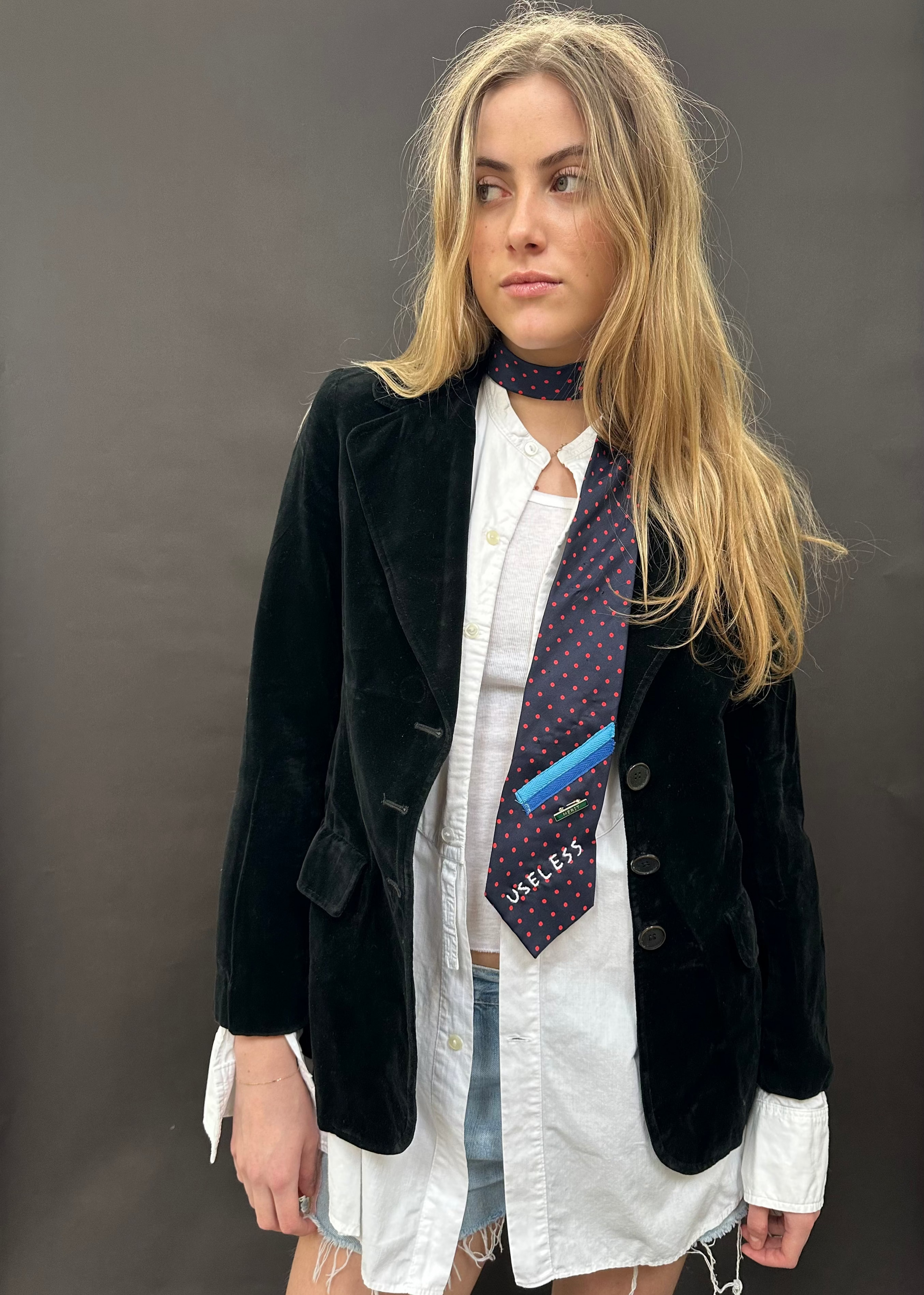 Upcycled second-hand tie, reimagined with a nod to Patti Smith’s effortless style, worn casually around the neck like a scarf or loosely knotted. We’ve hand embroidered on the Useless name, added a vintage Merit pin, and finished it with our signature double tabs.