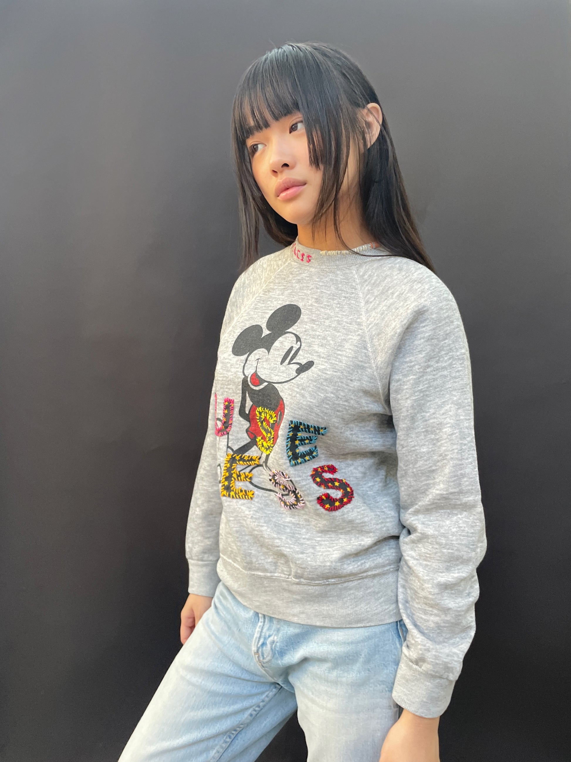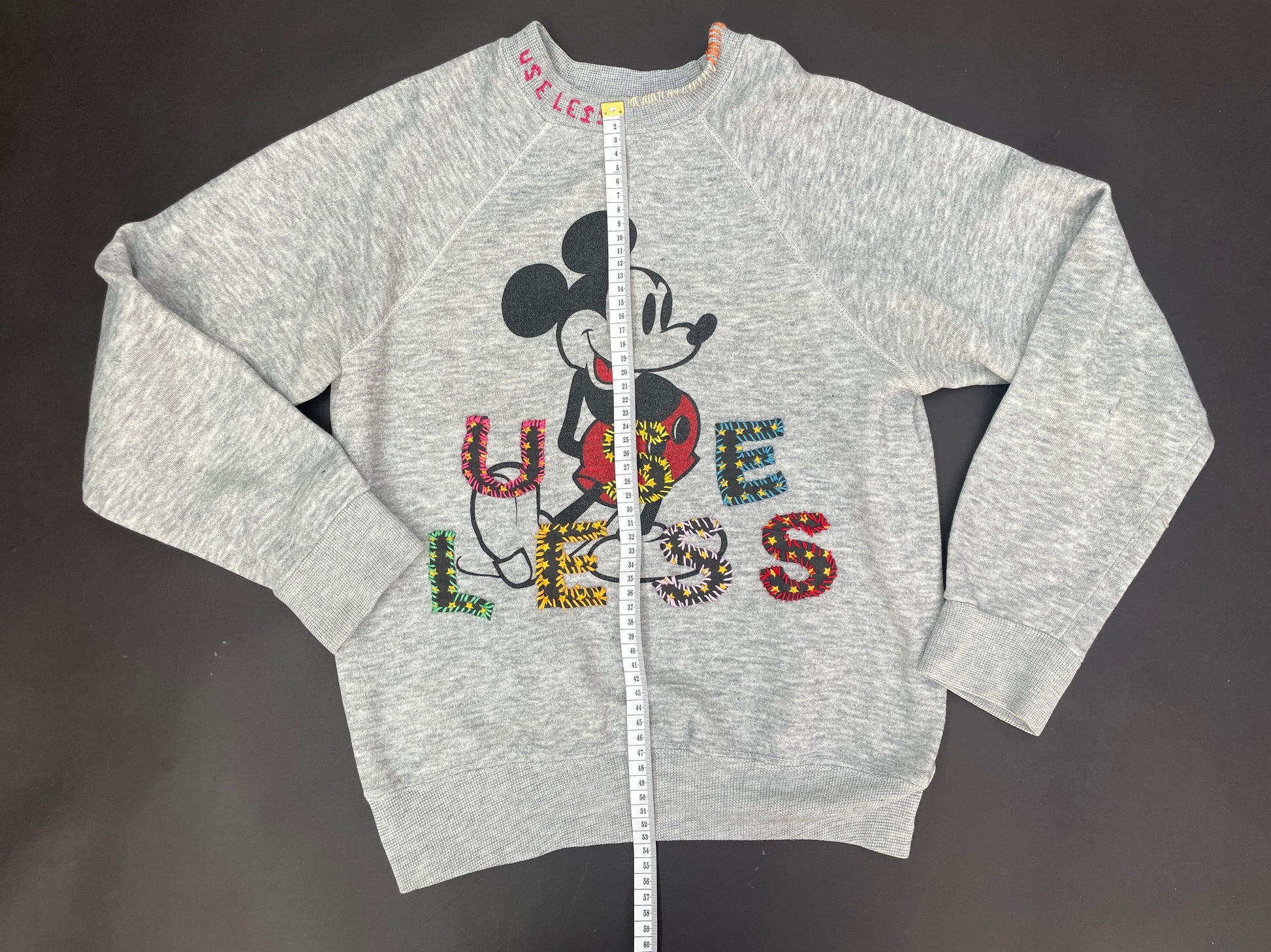Upcycled Vintage Mickey Mouse Sweatshirt with appliquéd Useless slogan. Also featuring hand stitching around the collar.
