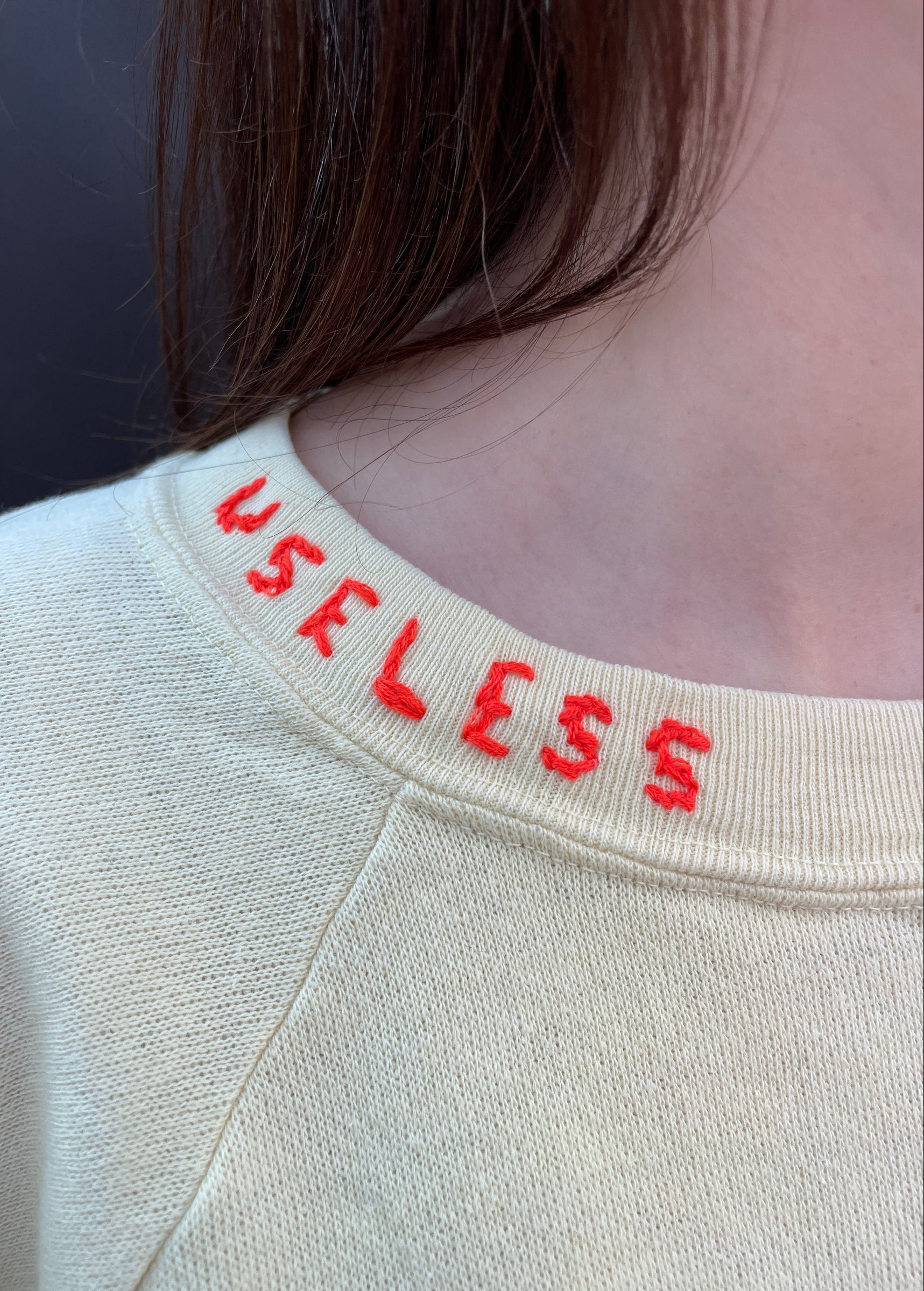 Upcycled Vintage Mickey Mouse Sweatshirt with as hand embroidered Useless slogan on the crew neck.