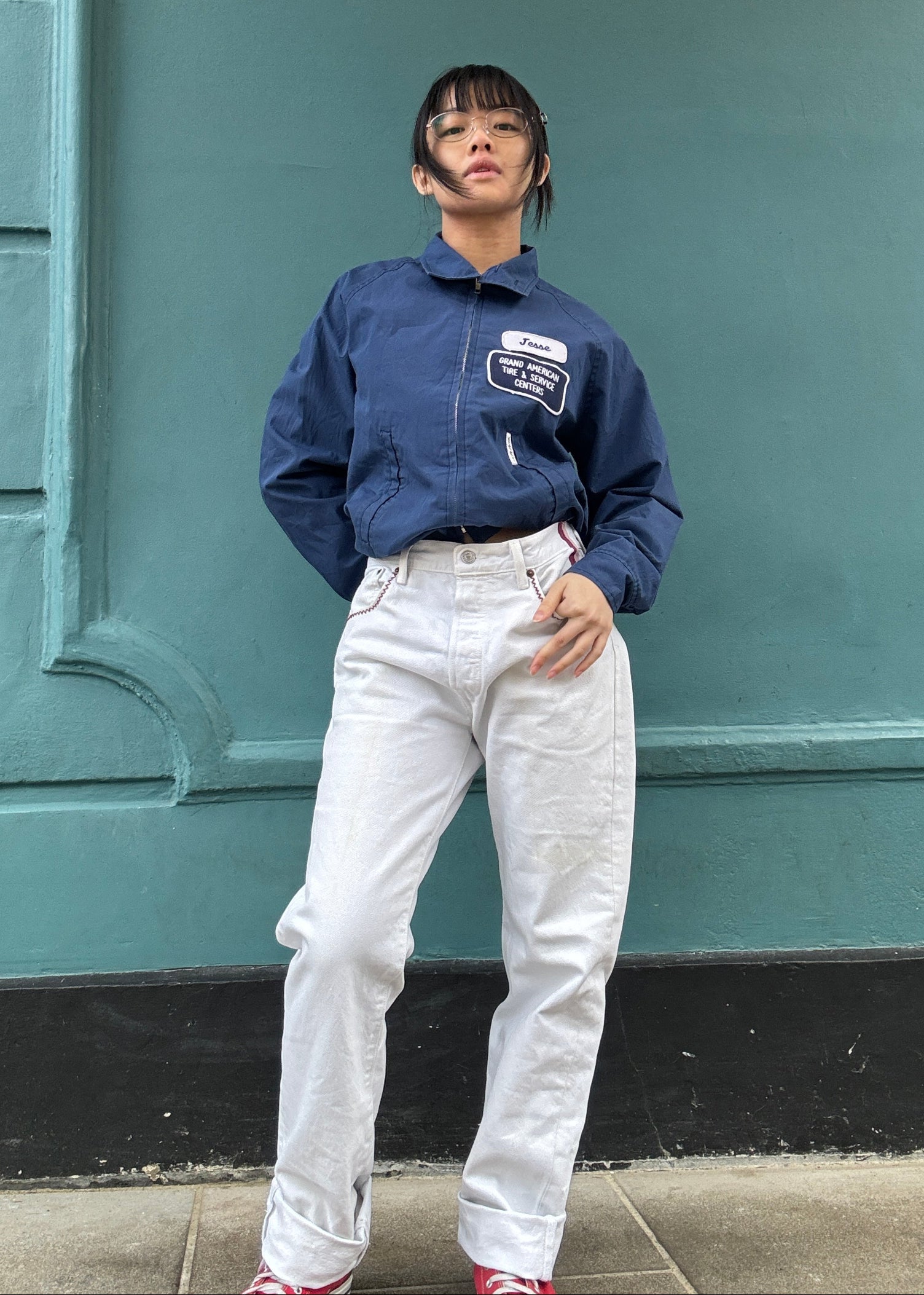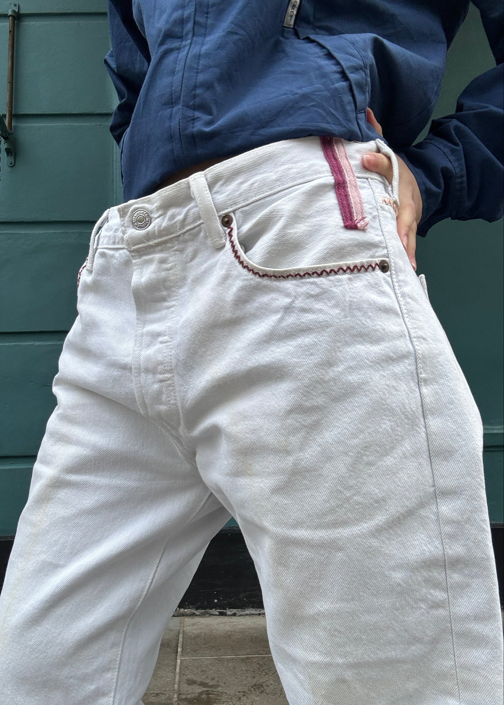 Upcycled vintage Levi's in a white denim. Featuring zig zag stitch embroidery across the front pockets and back yoke, our signature double tabs to the waistband and a bandana patch stitched on to the back.