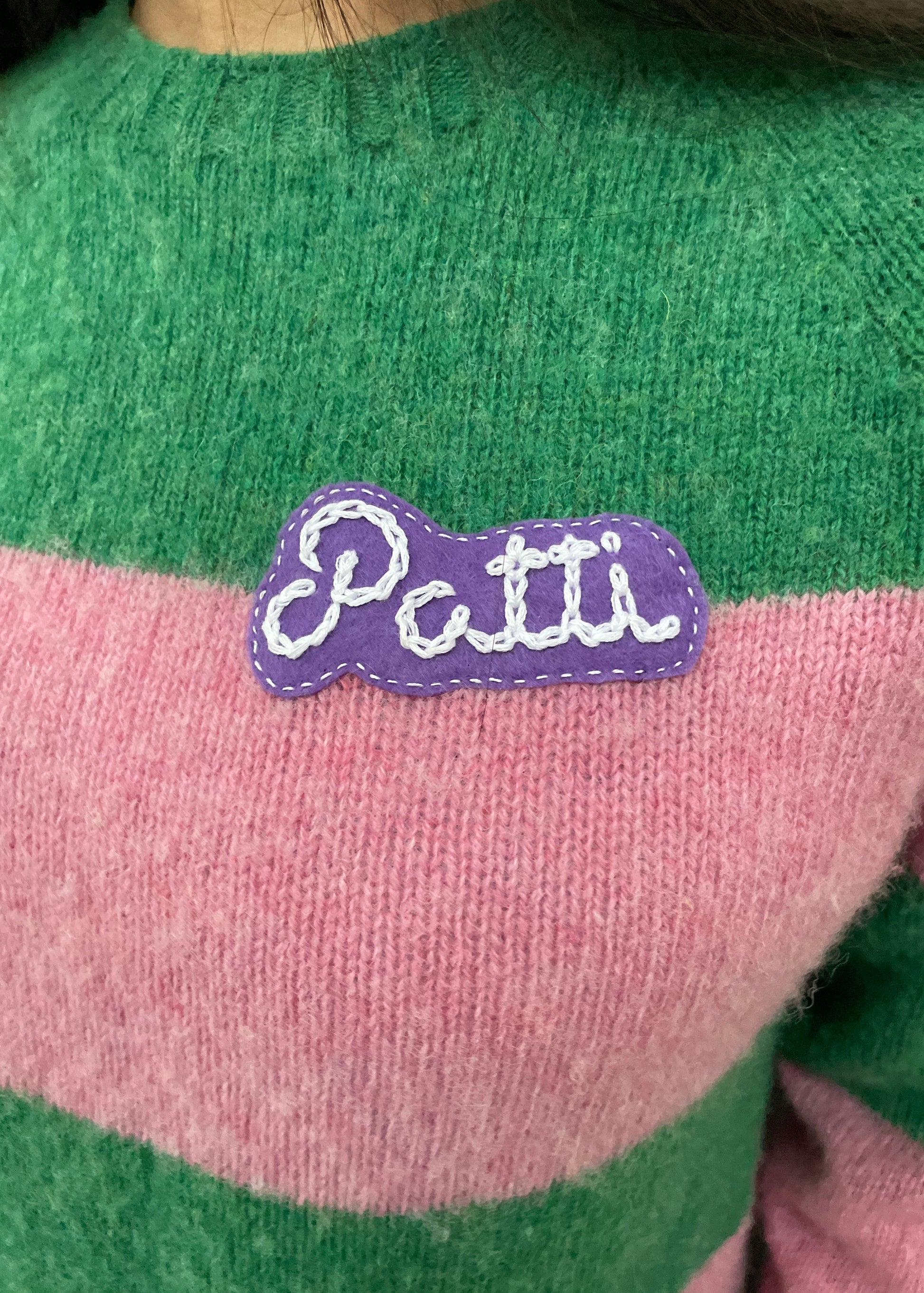 Upcycled from a 100% wool jumper Featuring bold green and pink stripes.. Finished with hand-sewn chain stitch Patti patch and our signature double tab at the hem.