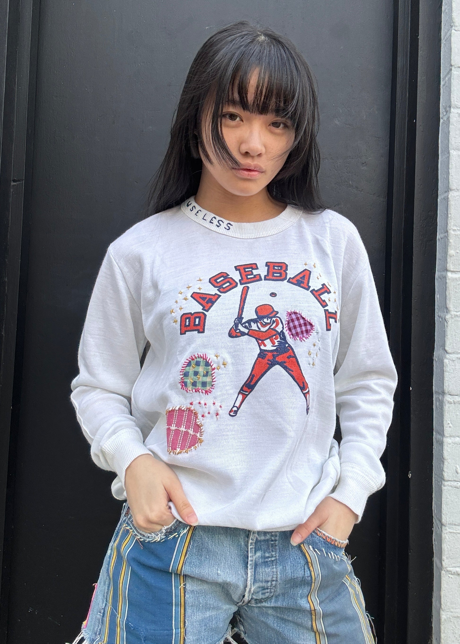 Vintage 'Baseball' sweatshirt featuring hand-stitched patching and embroideries. Our hand-stitched 'Useless' motif appears at the neck.