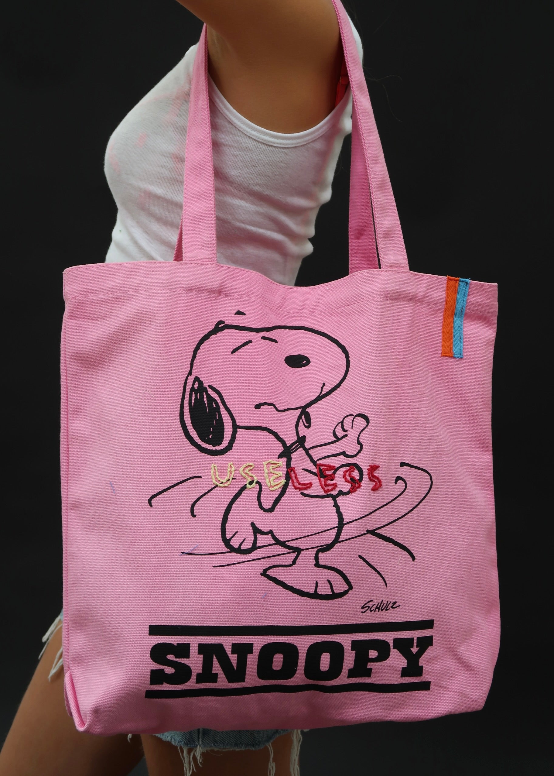 Useless Snoopy Embroidered Pink Tote, featuring yellow and red 'useless' embroidery and colourful tabs at the top.