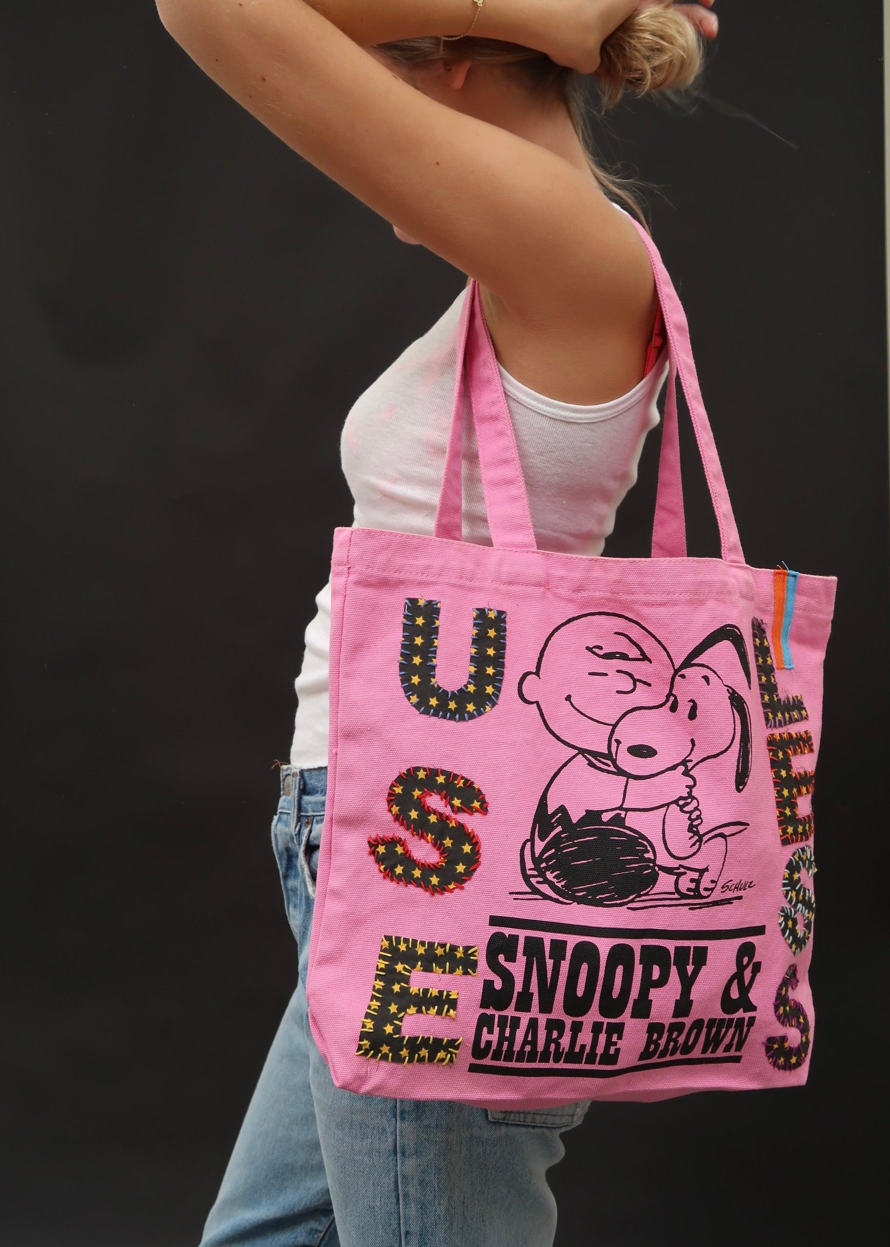 Useless Snoopy Embroidered Pink Tote, star fabric 'useless' patches and colourful tabs at the top.