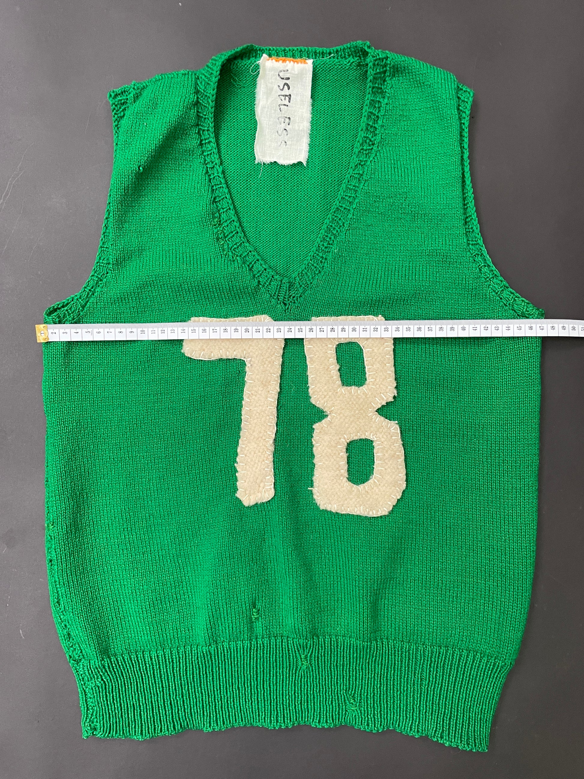 We have upcycled this cute knitted vest with a '78' appliqué made from deadstock fabric, giving it a vintage sports vibe.