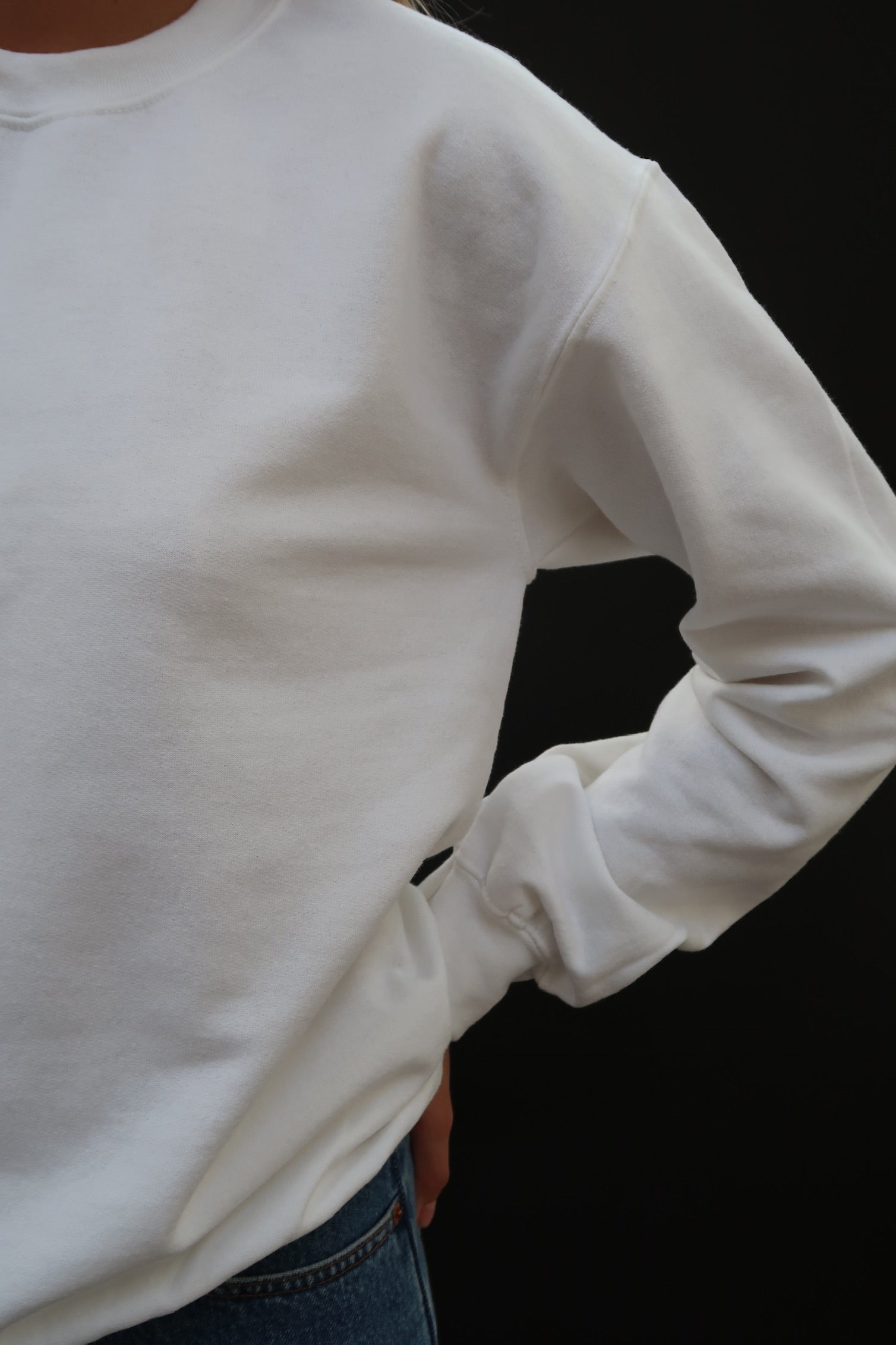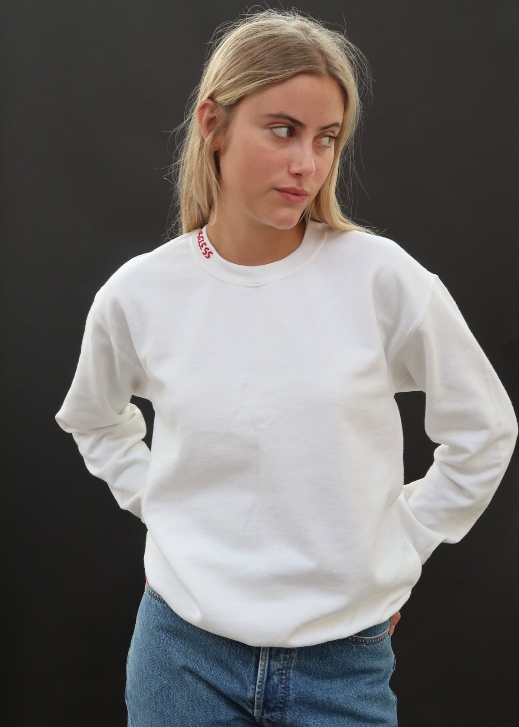A perfect vintage plain white long sleeve super soft sweatshirt. We have reworked this piece with our USELESS logo hand embroideredin red to the neck, and a yellow sunshine embroidered on the back.