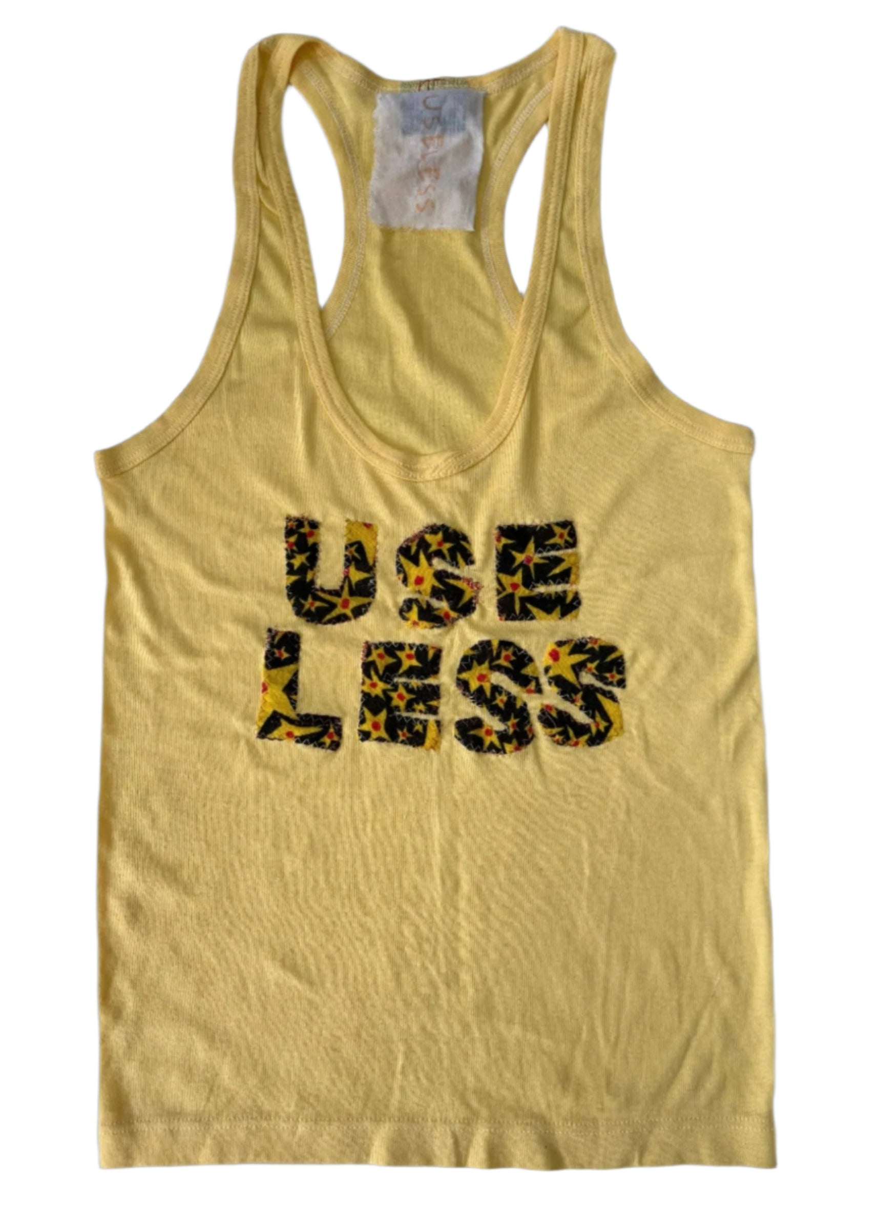 Dead stock yellow racer back vest featuring applique USELESS in a fab star print.